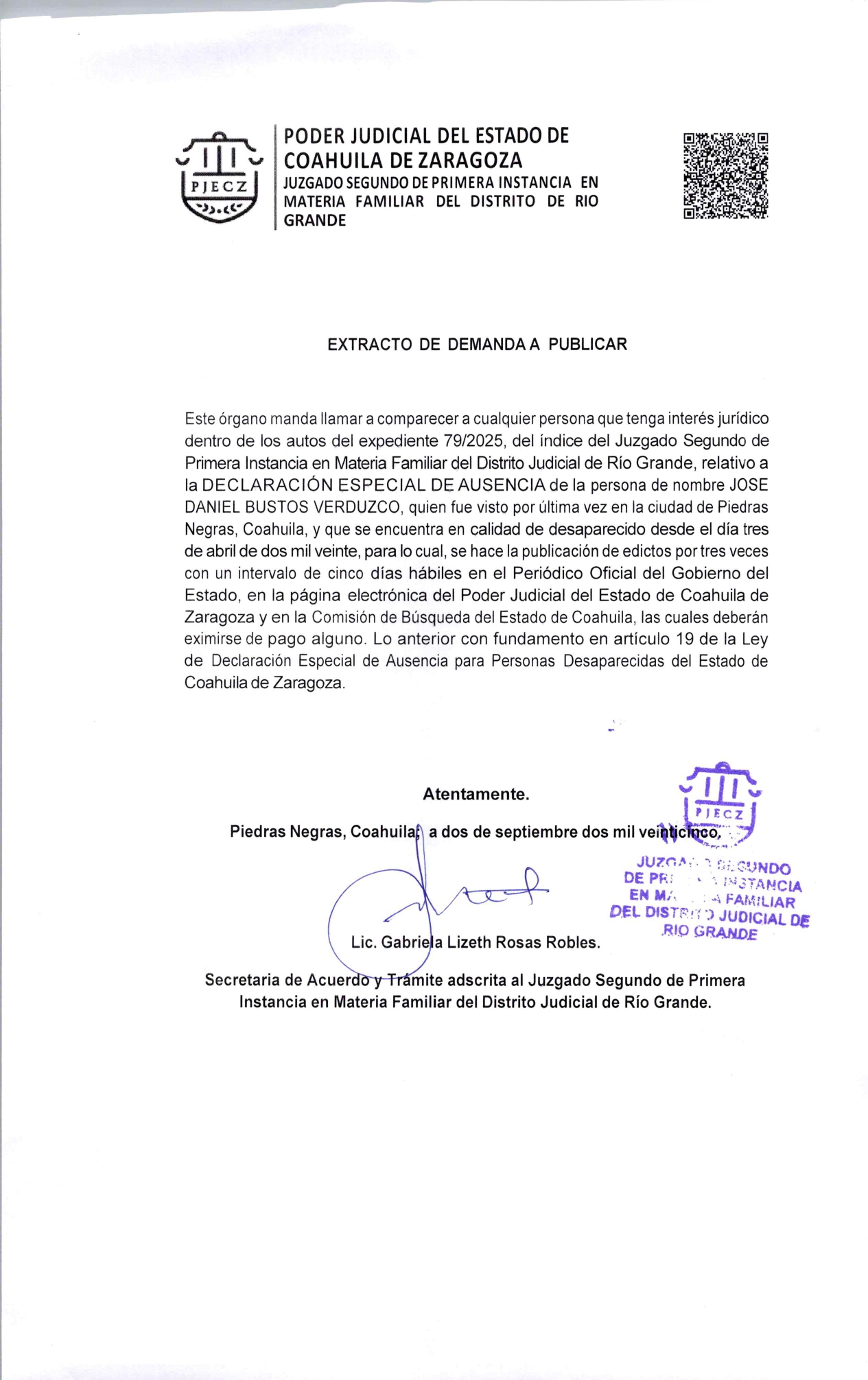Edicto por motivo del procedimiento especial de declaración de ausencia, de la persona desaparecida de nombre José Daniel Bustos Verduzco, promovido por Juanita Amalia Bustos Verduzco.