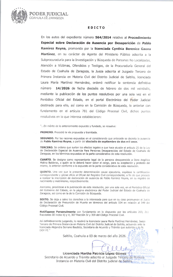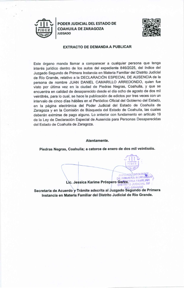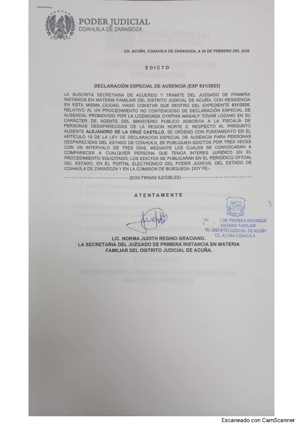 Edicto por motivo del procedimiento de declaración de ausencia, en favor de Christian Omar Belmonte Haro, promovido por la Lic. Yuridia Noemi Lugo Burciaga, Agente del Ministerio Publico adscrita a la Fiscalía de Personas Desaparecidas, de la Fiscalía General de Justicia del Estado de Coahuila de Zaragoza.